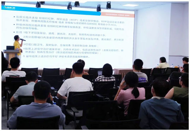 随后,新桥口腔成都武侯院区门诊主任叶宏和种植医生韩沛分别带来了《种植体周围炎》和《半口种植成功率影响因素分析》的案例分享。叶宏主任结合一则具体案例,就种植体周围炎的分类、临床表现及处理方式等进行深入分析。韩沛医生同样以一则半口种植案例为切入点,针对影响种植成功率的各项因素展开具体分析。