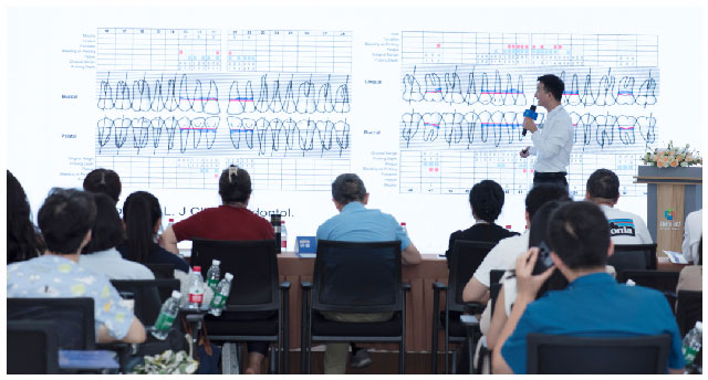 鲁维希主任在点评病例时表示:“井医生展示的两个病例都非常具有代表性。特别是隐形矫治器治疗成人骨性II类错颌,患者牙性前凸占较多,还伴有下颌后缩,治疗难度很大,井医生采用强支抗控制技术控制后牙近中移动量,在安全范围内最大化内收上前牙,取得了显著的面部侧貌改善。同时,在前牙内收过程中,井医生特别注意了控根移动,采用45°-55°的最佳施力角度实现了前牙的整体移动与压低,取得了理想治疗效果,展示了扎实的正畸专业功底。”