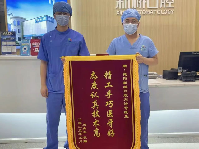 近日,新桥口腔德阳院区的种植专科刘诗奇医生收到了一份沉甸甸的“感谢状”,一面红底金字的锦旗。锦旗背后,是患者小东(化名)与长期缺牙困扰以及自身生活习惯的博弈。