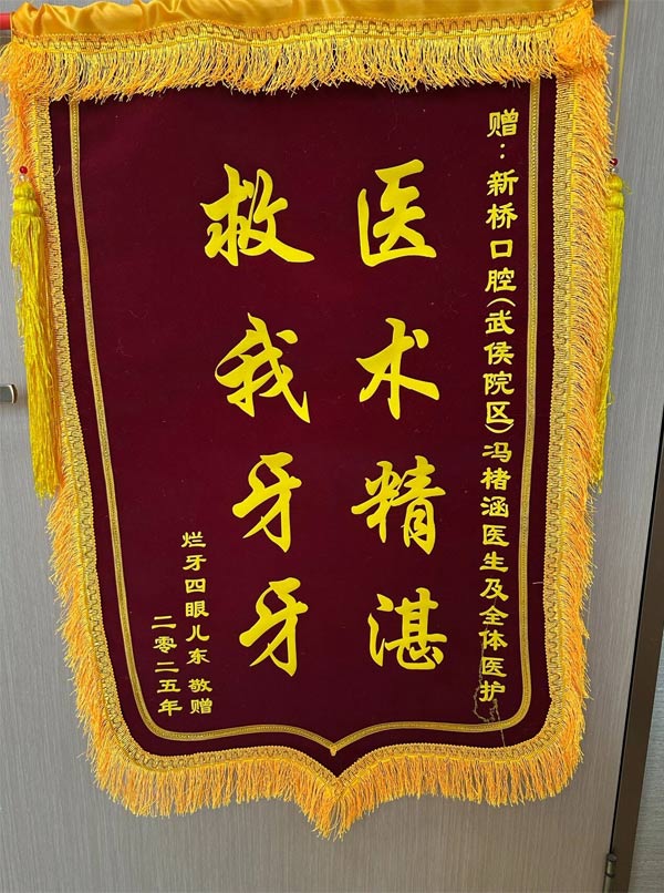 近日,新桥口腔成都武侯院区冯楮涵医生团队收到了一份别出心裁的锦旗,上面俏皮地写着“医术精湛,救我牙牙”。