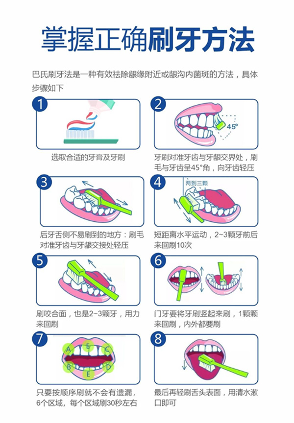 实践正确的巴氏刷牙法,保证2-3分钟时长。