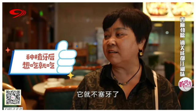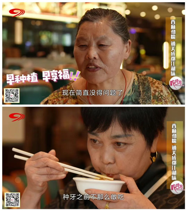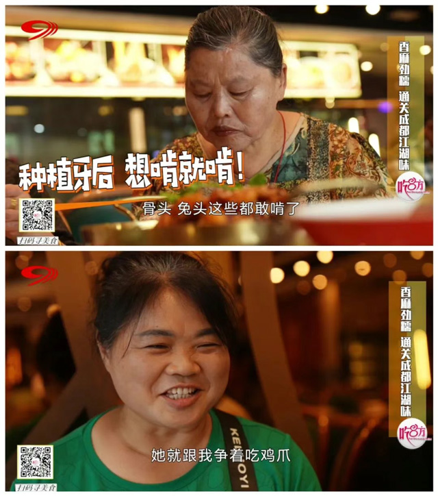 第一关便为大家呈上了主打招牌菜——情妹耙泥鳅,软弹鱼皮下的嫩肉在滚烫红油中被煮到软烂,麻辣汤汁则是浸入每一丝肉缝,只有牙口好才能品出这一层叠的香。菜品上桌,只见团员们毫无惧色,嚼得欢快过瘾。陈阿姨表示:“种牙之前不那么敢吃,因为这个吃了牙龈要发炎要痛。”曾经饱受缺牙痛苦的刘阿姨,如今种好牙后也能细细品味,并表示:“现在简直没得问题了,吃起来多好的!”
